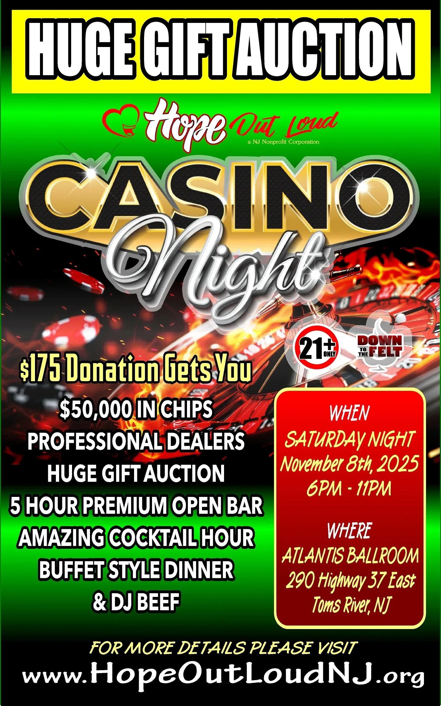 5 Hour Event to help Local Ocean County NJ Families in need. This Casino night will be Premium Open Bar, Dinner Buffet, DJ/Entertainment and winning lots of prizes!